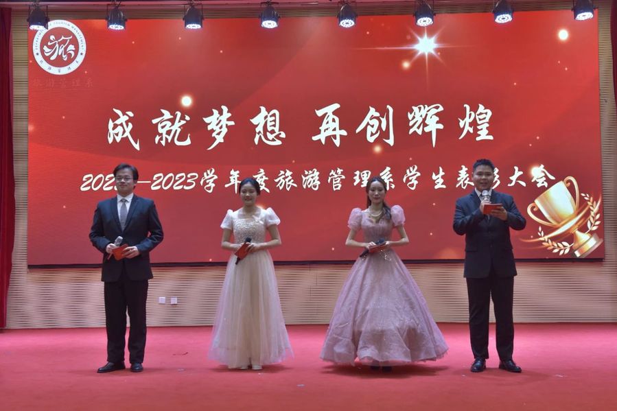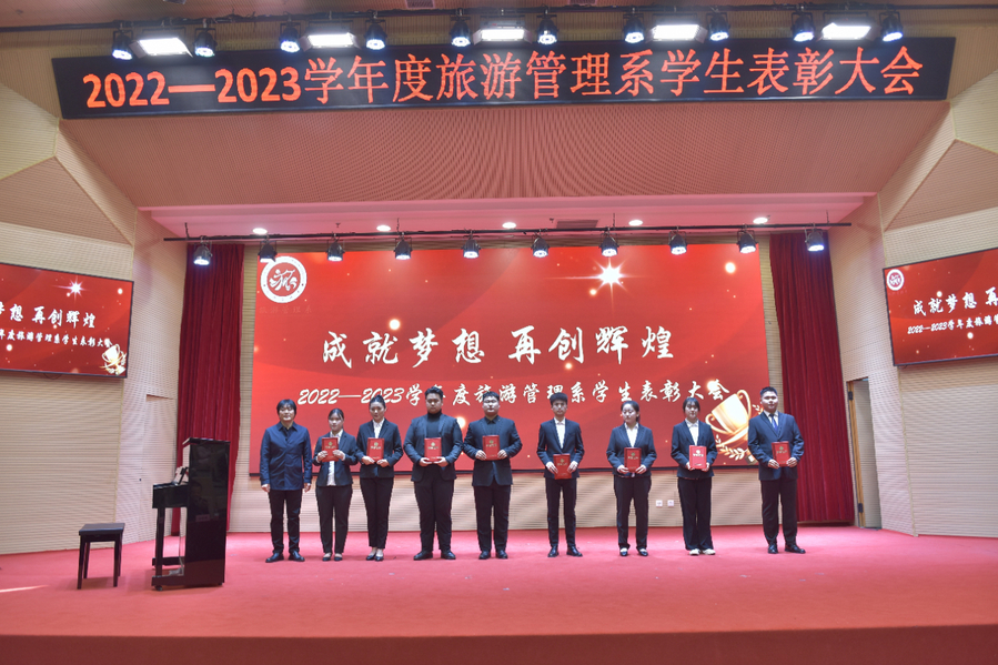音乐会开始前举行2022-2023学年度旅游管理系学生表彰大会。周宝玉为大会致辞,他表示,新时代青年要不负韶华,不负时代,不负人民,以奋斗姿态激扬青春、追逐梦想。旅游管理系领导为职教周技能大赛获奖学生、优秀学生干部、优秀学生、优秀学生会干部、优秀志愿者、优秀班级、文艺先进个人进行了颁奖。