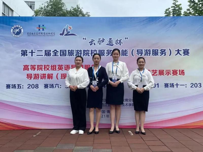 为提高学生技能水平,加强与其他旅游院校的交流学习,永利yl23411官网旅游管理系高明明、孙一凡、赵静、殷燕4位学生组成参赛队伍,经过2个月的紧张备赛,于5月12日在旅游管理系党总支书记周宝玉及指导老师的带领下赴青岛酒店管理职业技术学院参加比赛。