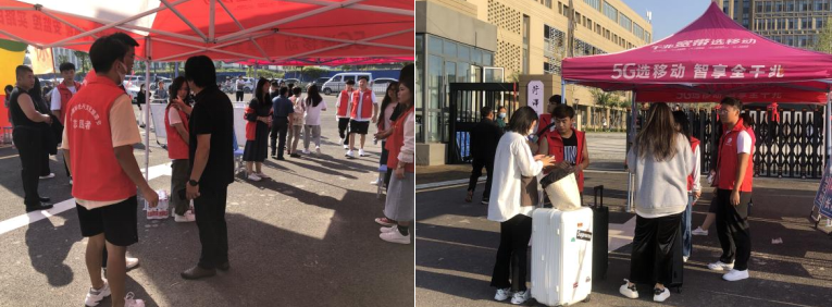 进入校园,志愿者们为新生指引路线、搬运行李,校园内还设有咨询处和志愿者服务处,志愿者们穿梭在人群中,耐心为学生提供咨询服务。