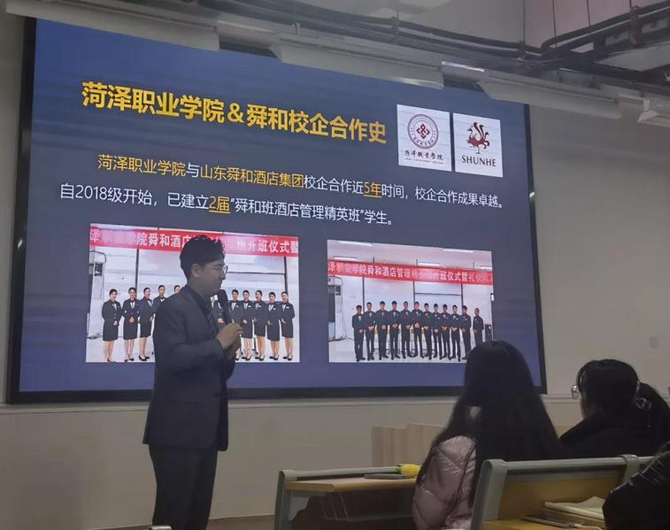12月15日下午,永利yl23411官网旅游管理系邀请山东舜和酒店集团召开校园专场招聘宣讲会。旅游管理党总支系书记周宝玉,校企合作处副处长李鸿浩,山东舜和酒店集团副总裁白璐、总经理刘康出席会议,旅游管理系2021级酒店管理与数字化运营专业和旅游管理专业全体学生及班主任参会。 白璐向与会同学介绍了集团概况。山东舜和酒店集团是一家专业从事酒店策划、投资、经营、管理的大型股份制企业,是山东省最具影响力的酒店集团之一,中华美食联盟、山东省精品旅游促进会会长单位。刘康对同学们关注的个人成长空间、薪酬待遇、实习地点、实习岗位等问题进行了详细介绍。此次宣讲洽谈是与旅游管理系合作成立舜和酒店管理精英班,为2021级同学们开辟一条通向行业顶尖领域的直通车。