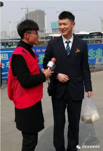 广场中央的采访小组正在向过往的旅客、路人以及我们的乘务员们进行采访,向他们提问关于雷锋月问题 并发放礼品纪念。