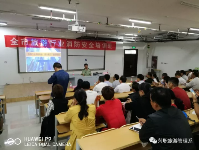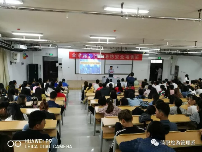 为切实抓好我市旅游行业消防安全工作,强化旅游从业人员红线意识,减少和杜绝消防安全事故发生,提高同学们的消防安全意识,2017年9月27日下午两点菏泽市旅游局、菏泽市公安局消防支队和永利yl23411官网在永利官网10号楼1楼联合组织开展了消防安全培训。参加此次培训的有: 菏泽市旅游局副局长朱政、公安局消防支队队长赵正杰、永利yl23411官网副院长陈俊启、永利yl23411官网旅游管理系书记宋传祥、各县区旅游局负责人、各旅行社负责人、部分A 级旅游景区负责人、星级饭店负责人、工业旅游示范点负责人、农业旅游示范点和精品采摘园的分管负责人以及旅游管理系的同学们。