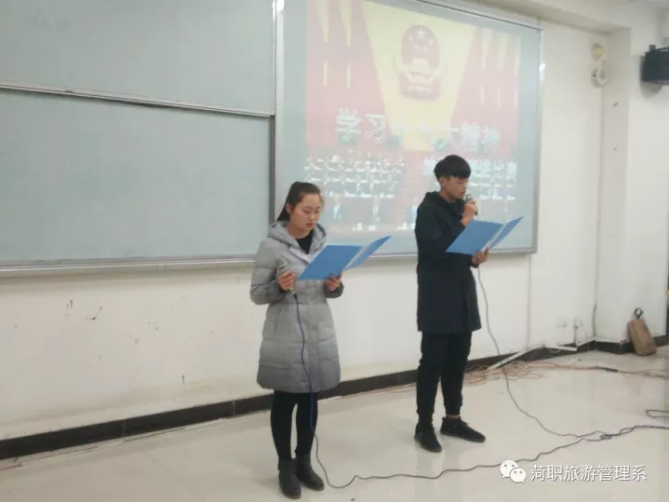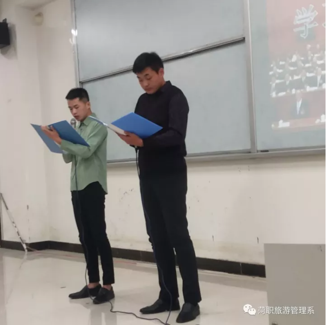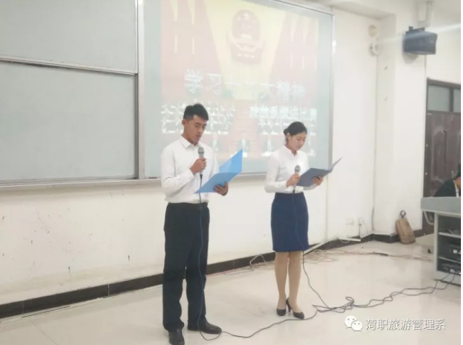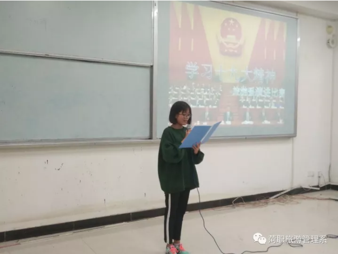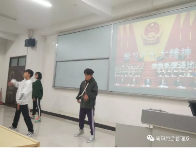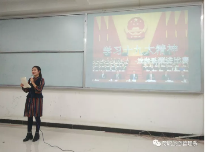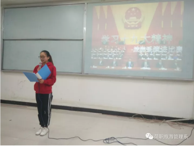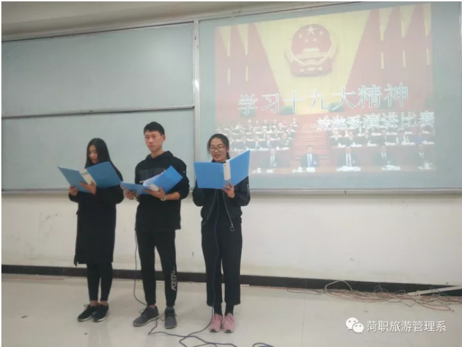 历史是人民书写的,一切成就归功于人民。只要我们深深扎根人民、紧紧依靠人民,就可以获得无穷的力量, 风雨无阻,奋勇向前。滔滔历史长河,巍巍丰碑耸立。在中国共产党九十六年的奋斗征程中,党的十九大注定是一座影响深远的里程碑,既辉映过去,又对推进新时代中国特色社会主义伟大事业作出全面部署。我们旅游管理系于十一月二十一日晚举行了十九大精神演讲比赛。评委嘉宾有:宋书记、黄主任、朱老师、杜老师、张老师。