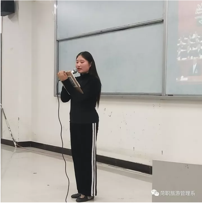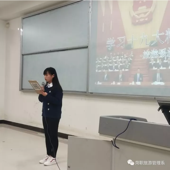 第一位上台朗诵的是17级旅游管理班郭爱华同学带来的演讲《不忘初心,永跟党走》