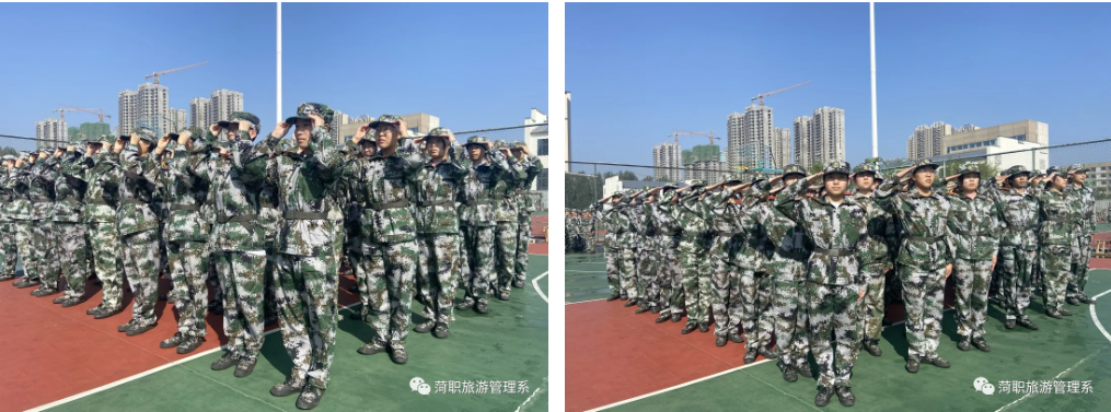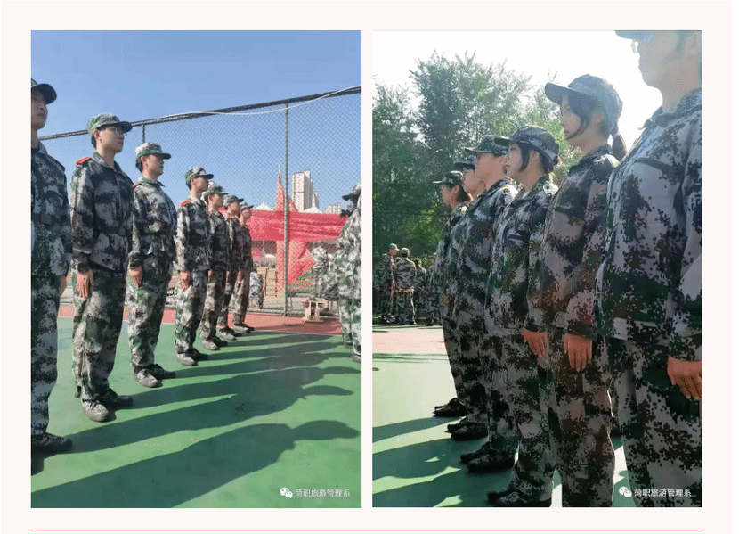 迎着初升的朝阳,旅游管理系2021级新生迷彩戎装、英姿飒爽,踏着铿锵有力的步伐在鲜红的五星红旗下斗志昂扬。