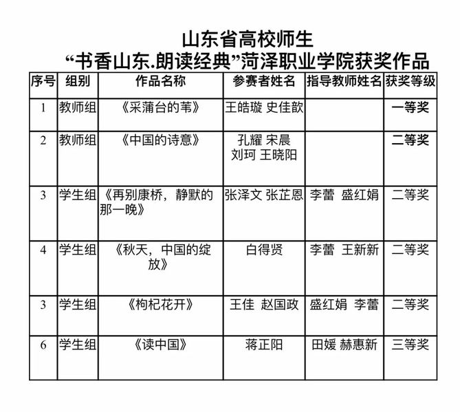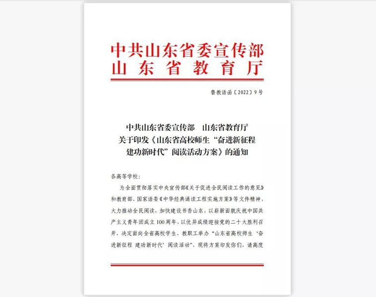 9月8日,山东省教育厅官网公示了山东省高校师生“奋进新征程 建功新时代”阅读活动“经典朗读”项目获奖名单,我院参赛作品共获一等奖1个,二等奖4个,三等奖1个。从今年五月份起,由山东省委宣传部指导,省教育厅主办,省语言文字工作委员会办公室、山东教育电视台承办的山东省高校师生“奋进新征程 建功新时代”阅读活动在全省高校中开展,活动分设“书香山东·掌上读书”“书香山东·读书征文”“书香山东·经典朗读”三个子项目,我院宣传部认真组织,全校师生积极参与,在三项比赛中均斩获佳绩。我院将继续引导广大师生在阅读中提炼人生智慧,汲取知识力量,用阅读引领文化风尚,沉淀文脉底蕴,为奋进新征程、建功新时代注入强大精神力量,以优异成绩迎接党的二十大胜利召开。