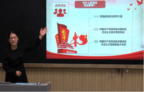 赵变丽老师参赛课例为《铸牢“定海神针” 汇聚磅礴伟力——为什么要坚持党的全面领导》,引导学生结合“三路”(回看走过的路、比较别的人、远眺前行的路),运用“三镜”(历史“变焦镜”、思想“透视镜”、时代“反光镜”),从历史、理论和实践三个维度清晰而深刻地讲述了坚持党的领导的重要性和必要性。