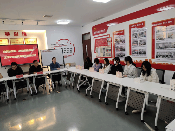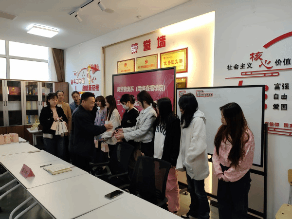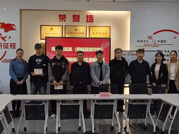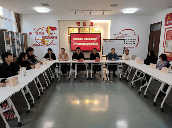 4月7日下午商贸物流系(网络直播学院)在8102会议室举行工学结合班优秀学生表彰仪式,商贸物流系(网络直播学院)党总支书记陈兆刚、系部指导教师代表、企业代表和优秀学生代表参加仪式。