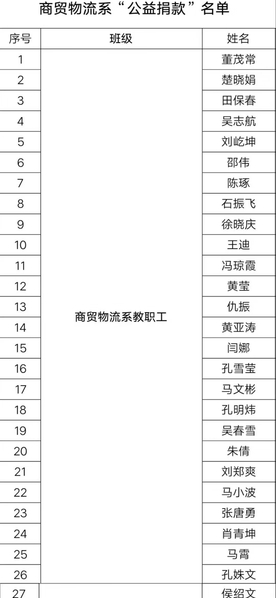 感谢本次参加募捐的老师、同学们,感谢大家伸出友爱之手,献出一份爱心。涓涓细流汇聚成海,点点星光照亮黑夜。小编代表商贸物流系感谢以下同学老师们的无私奉献。