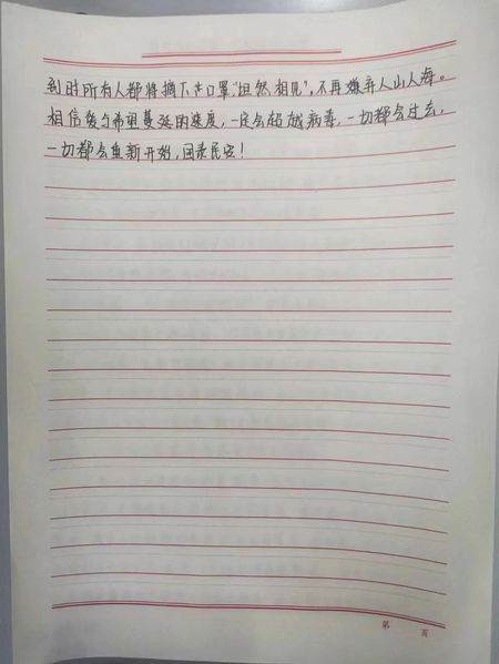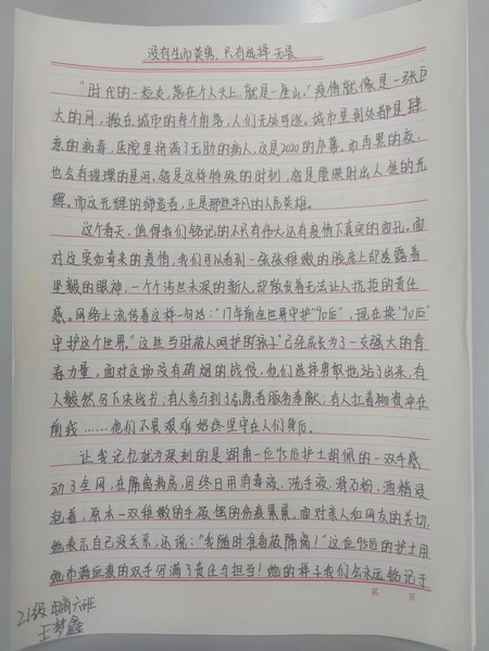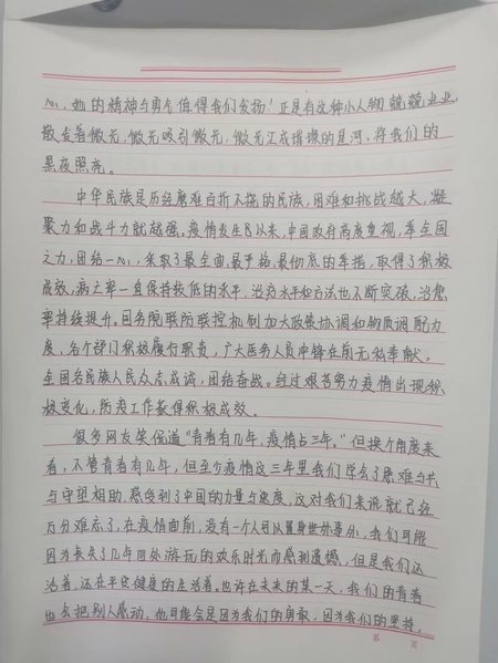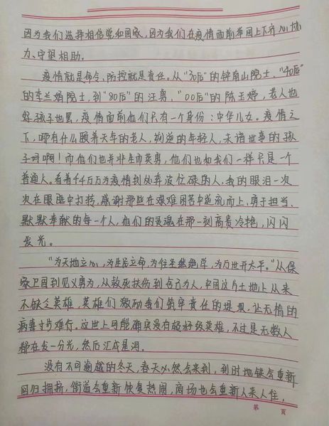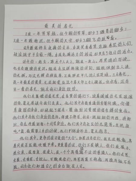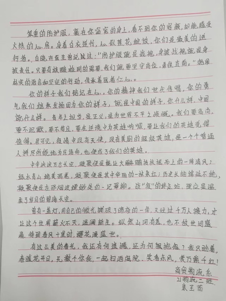 本次活动同学们积极响应,热情高涨,以笔作枪抗击疫情,以文传情鼓劲加油,把爱心融入笔墨,饱含深情地讴歌抗疫英雄,礼赞抗疫事迹,为奋斗在一线的防疫人员助威鼓劲,用纸和笔传递爱和力量。以下是获奖优秀作品,让我们一起来欣赏一下吧!