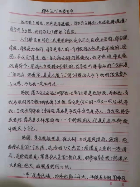 此次活动贴近生活,同学们写出自己的真情实感。同学们参与的积极性非常高涨,信心十足,一篇篇征文从不同视角,不同层面,不同体裁,对妇女同志深深的爱充分地展现出来,情感丰富,感人肺腑,篇篇征文浓浓深情。