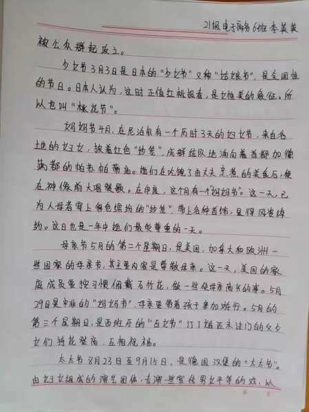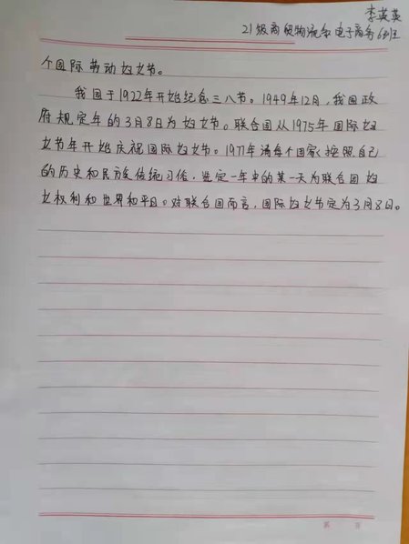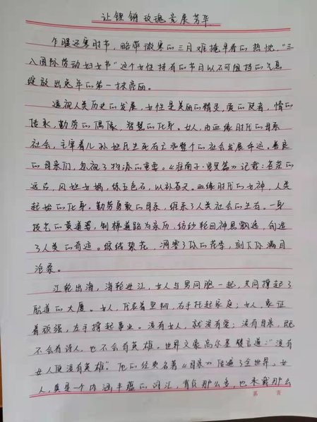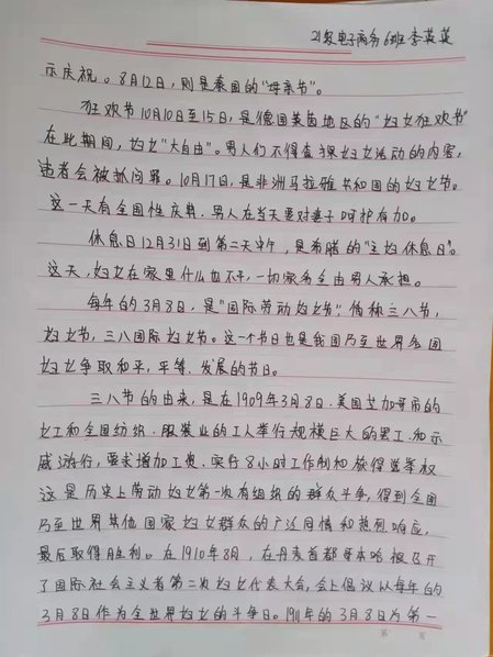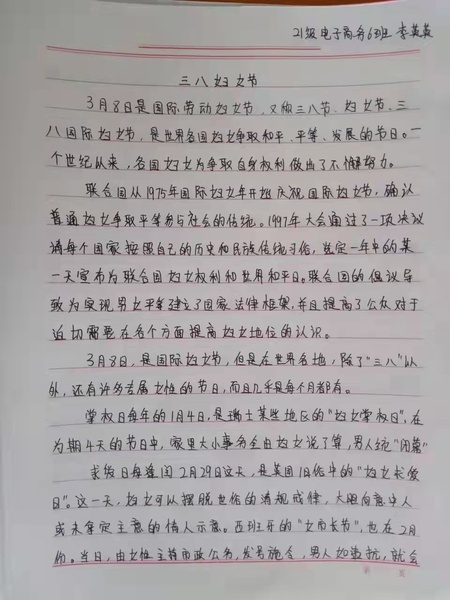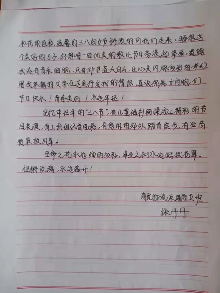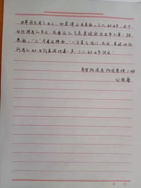 为了弘扬中华女性巾帼风范、善良坚韧、不甘人后等传统美德,反映新时代新女性的精神风貌,宣传广大女同胞在建设社会主义现代化伟大事业中做出的重大贡献,商贸物流系于3月8日举办了“三八”国际妇女节征文活动。