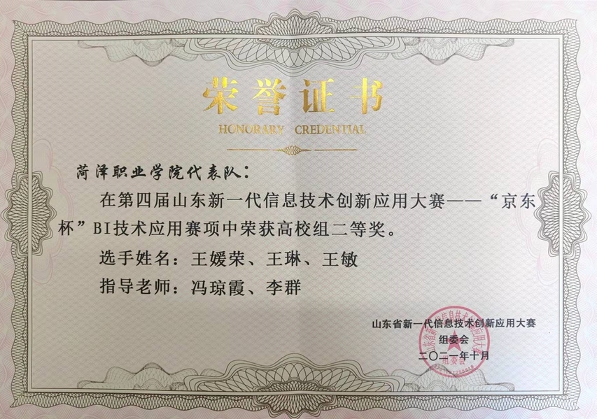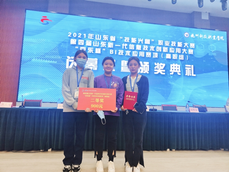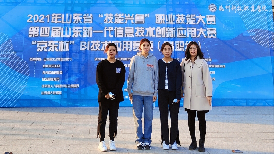 10月23日,在海阳云创智能科技产业园举办的山东省第四届新一代信息技术创新应用大赛——“京东杯”BI技术应用赛项正式落下帷幕,商贸物流系冯琼霞和李群老师指导的参赛队伍(队员:王媛荣、王琳、王敏)获高校学生组二等奖。
