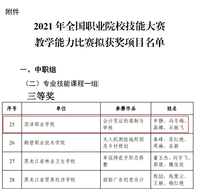 12月23日,2021年全国职业院校技能大赛教学能力比赛成绩揭晓。永利官网教师申静、冯冬梅、高娜、石振飞四位教师的作品《会计凭证的填制与审核》获专业技能课程一组(中职组)三等奖、山东省职业院校教学能力大赛专业技能课程一组(中职组)一等奖。实现了学校在此比赛项目上国奖的突破。