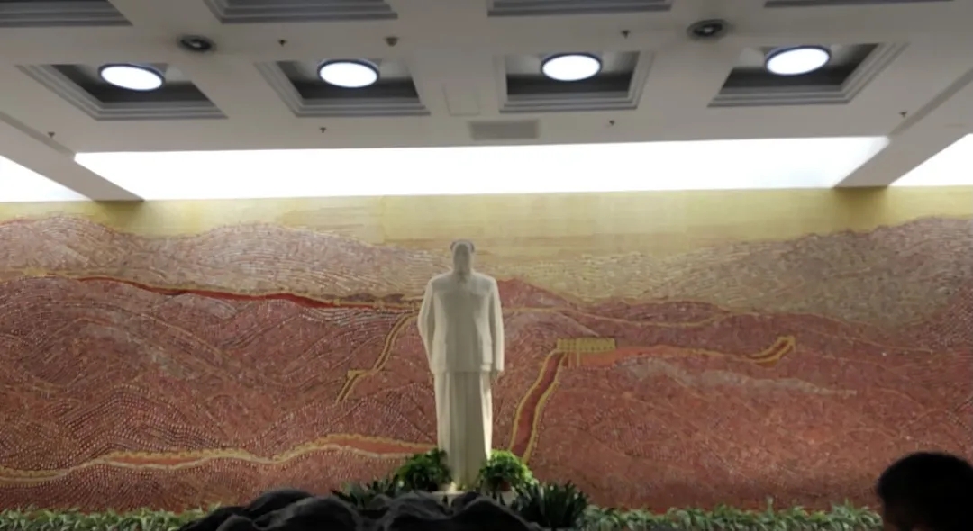 进入展厅,随着解说员的引领我们看到了一尊高四米的毛主席纪念像。身后是一幅金碧辉煌,光彩夺目的《万里长城》像章画,长26米,高5米,整幅作品共使用了189300枚各类像章镶嵌而成。相当的宏伟壮观。