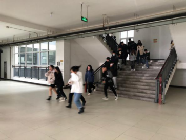 首先由各个班级各个班级班主任和班委带领同学们进行了捂口鼻、弯腰贴墙,井然有序快速的撤离教室。
