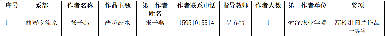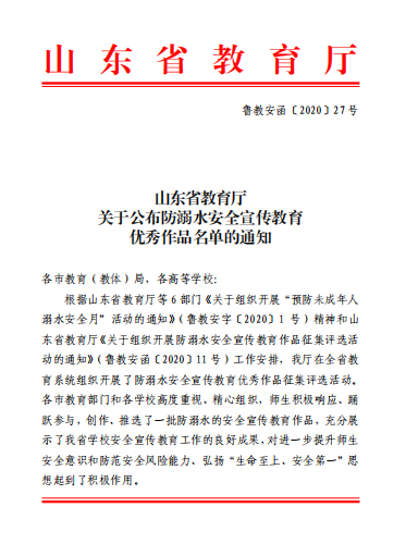 11月9日,由山东省教育厅主办,山东省学校安全研究与教育基地承办的《关于组织开展防溺水安全宣传教育作品征集评选活动》结果公示,永利yl23411官网商贸物流系19级电子商务二班参赛学生张子燕同学喜获高校组图片作品一等奖。评选活动开始前,参赛学生张子燕,利用自己的绘画专长在课余和暑假时间,不畏酷暑,刻苦锻炼,发挥创意,在指导老师吴春雪的指导下设计出《严防溺水》的海报,最终赢获得了高校组图片作品一等奖的优秀成绩。