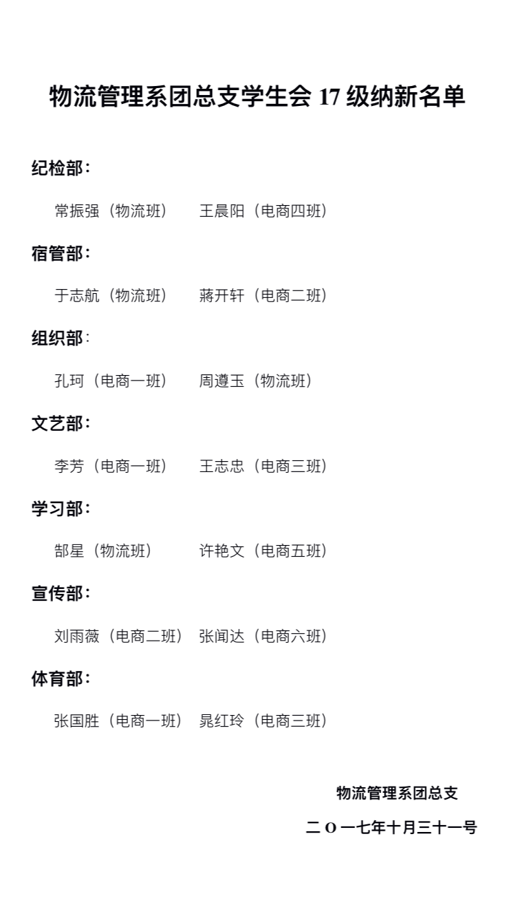物流管理系团总支学生会2017年新生纳新。物流管理系团总支学生会隶属与物流管理系,下设纪检部、宣传部、宿管部、组织部、学习部、体育部、文艺部七个部门。全面对物流管理系2017级新生进行纳新。本次纳新分为两轮,初试和复试。