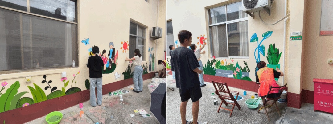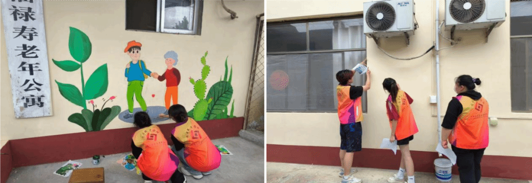 在快节奏的现代生活中,敬老院的老人们往往渴望更多的色彩与活力来丰富他们的日常生活。而墙绘作为一种独特的艺术形式,不仅能够美化环境,还能为老人们带来视觉上的享受和心灵上的慰藉。在两天的实践活动中,团队成员以敬爱老人为主题,准备了所需的墙绘工具,在带队老师指导下,团队成员密切配合、通力合作,有条不紊地进行墙面打底、着色等基础工作,在大家的共同努力下最终呈现了完美的画面,为老人们的居住生活环境增添了勃勃生机。