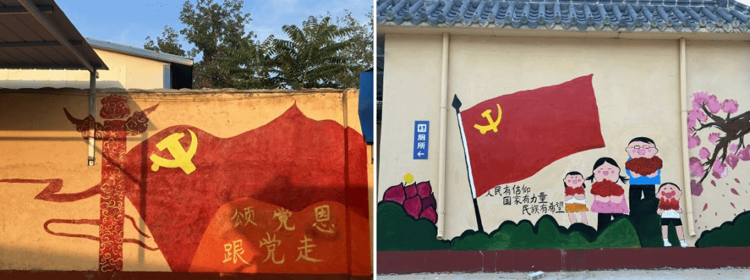 同时,为了庆祝中国共产党成立103周年,实践队的同学们用画笔绘出含有党的标识和国家政策标语的鲜明图案,作为当代大学生献给党的生日礼物,向党表达崇高的敬意。这些画作以通俗易懂的方式向村民们展示出了中国共产党走过的百年征程,画中的“颂党恩·听党话”六个字引导群众,坚定不移的跟党走,自信满满向强国目标大踏步迈进。