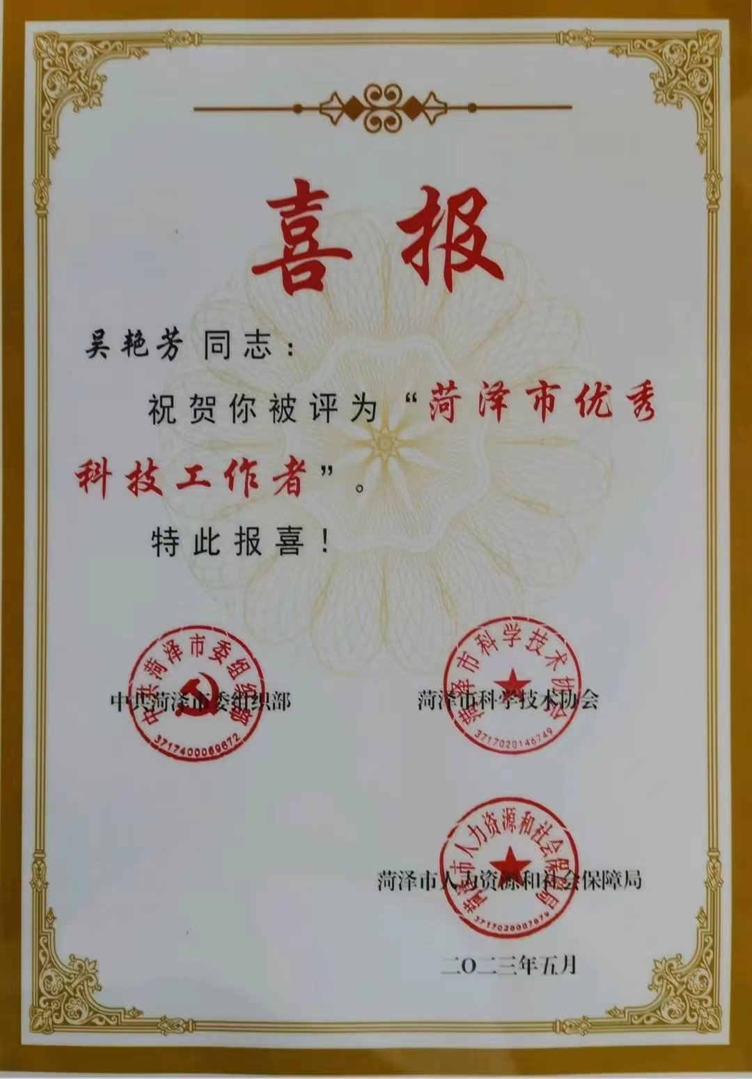 近期接到有关部门通知,我院教师吴艳芳获得了“菏泽市优秀科技工作者”荣誉称号。该荣誉称号是由中共菏泽市委组织部、菏泽市科学技术协会、菏泽市人力资源与社会保障局等单位,为了弘扬“尊重知识、尊重人才”时代风尚,激励广大科技工作者积极投身人才强市和“科教兴菏”战略,在全市范围内经过严格选树联合授予的。