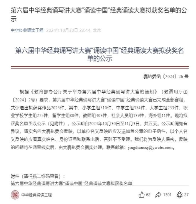 此项赛事是由教育部、国家语委主办的全国性、公益性赛事。根据《教育部办公厅关于举办第六届中华经典诵写讲大赛的通知》(教语用厅函〔2024〕2号),经过全国各省级行政区和新疆生产建设兵团的选拔推荐和专家评审,从4160件作品(含海外组),10000余名选手中评选出270件作品进入全国总决赛。
