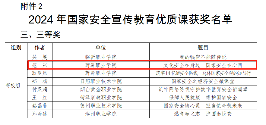 近日,山东省教育厅公布了2024年山东省国家安全宣传教育系列活动评选结果,永利官网信息工程学院教师范兴经过初赛、复赛和决赛的严格筛选,在此次活动中荣获三等奖。