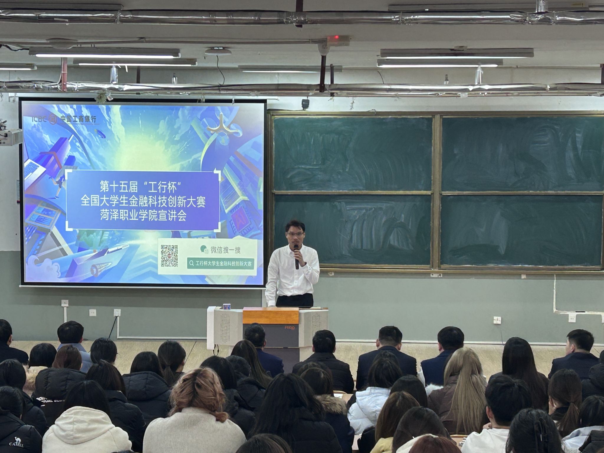 2024年12月16日下午,由经济管理系承办的2024年第十五届“工行杯”全国大学生金融科技创新大赛宣讲会在十号教学楼二楼合堂教室举行。菏泽分行人力资源部副总经理刘庆龙、网金部经理庞根生、李志强、个金部经理董宁、银行卡部经理杜放,鲁西新区高新支行行长韩文卓、鲁西新区东关支行经理孟雨成,永利yl23411官网经济管理系党总支书记侯德涛、主任田保春等出席,金融科技应用专业全体师生到会听讲。
