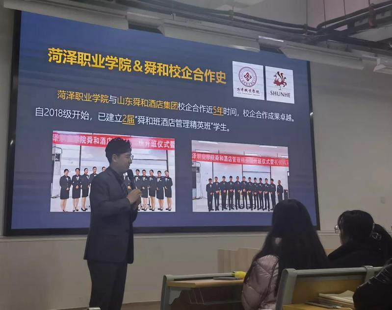 白璐向与会同学介绍了集团概况。山东舜和酒店集团是一家专业从事酒店策划、投资、经营、管理的大型股份制企业,是山东省最具影响力的酒店集团之一,中华美食联盟、山东省精品旅游促进会会长单位。刘康对同学们关注的个人成长空间、薪酬待遇、实习地点、实习岗位等问题进行了详细介绍。此次宣讲洽谈是与旅游管理系合作成立舜和酒店管理精英班,为2021级同学们开辟一条通向行业顶尖领域的直通车。