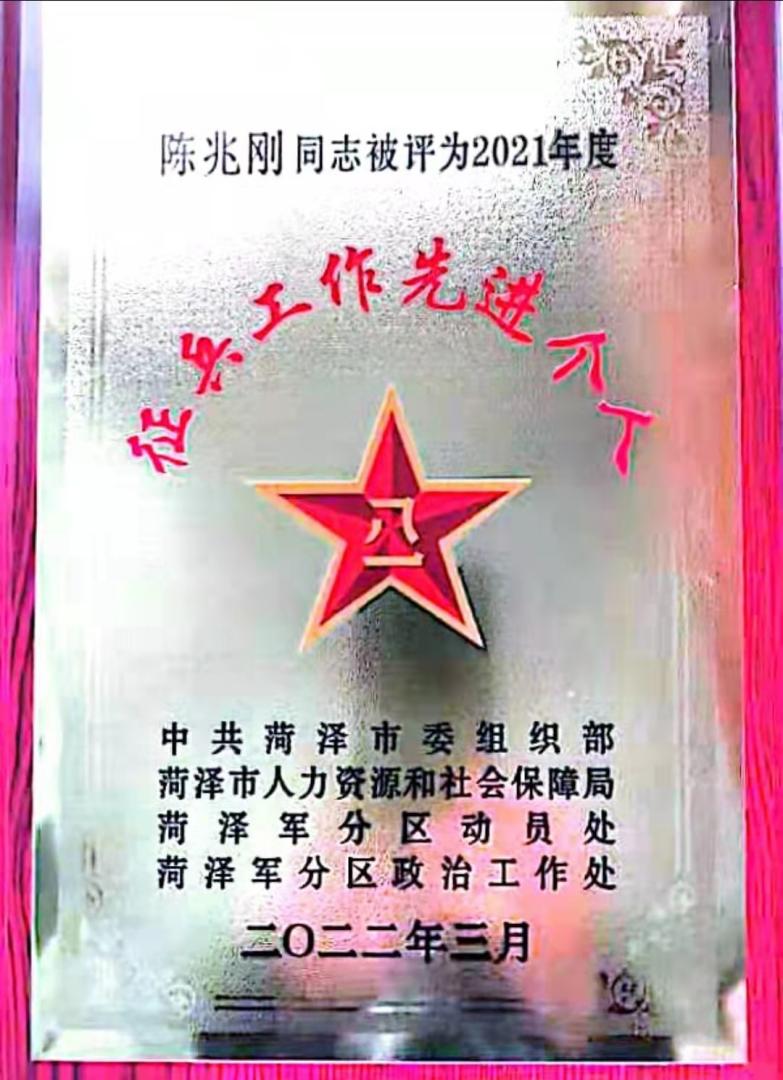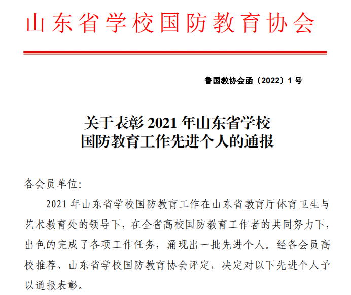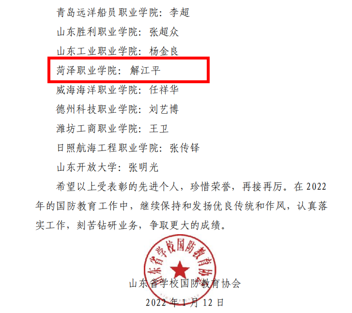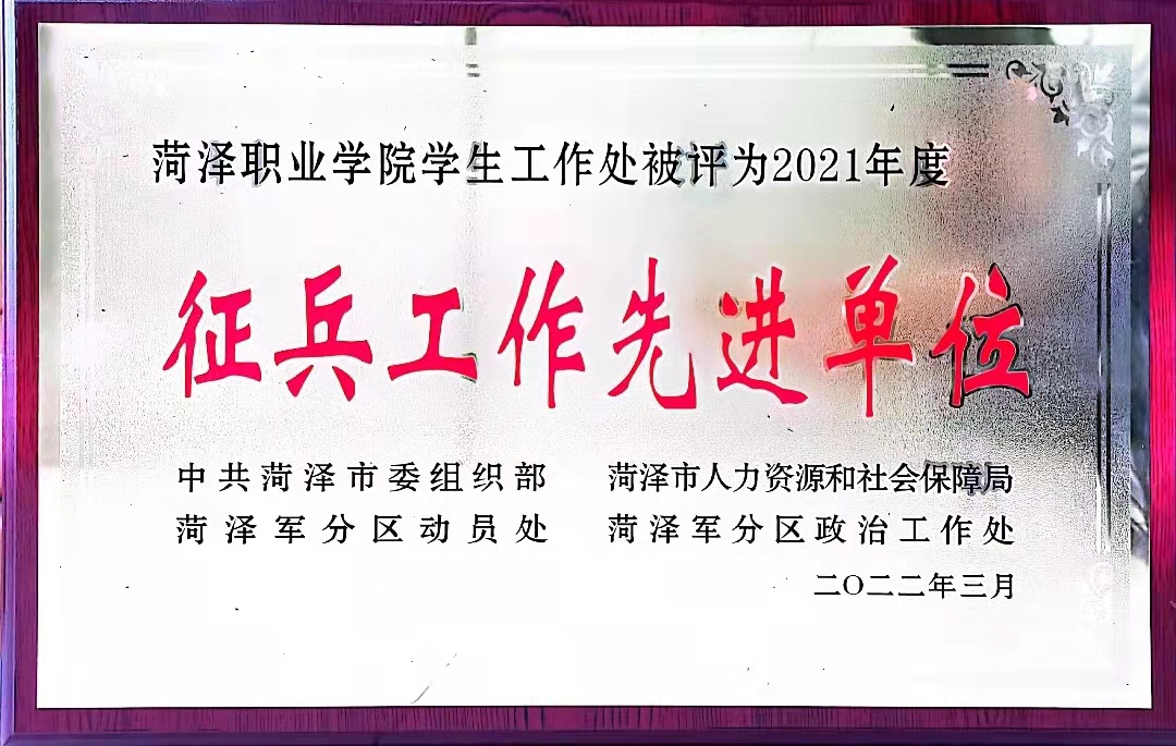 近日,中共菏泽市委组织部、菏泽市人力资源和社会保障局、菏泽军分区动员处、菏泽军分区政治工作处联合下发《关于表扬2021年度全市民兵和征兵工作先进单位、先进个人的通报》(动联〔2022〕2号),永利官网学生工作处(人民武装部)被评为菏泽市“征兵工作先进单位”。学生工作处处长陈兆刚被菏泽市委组织部、菏泽军分区评为全省“征兵工作先进个人”,学生工作处(人民武装部)副处长解江平被评为“山东省学校国防教育工作先进个人”。