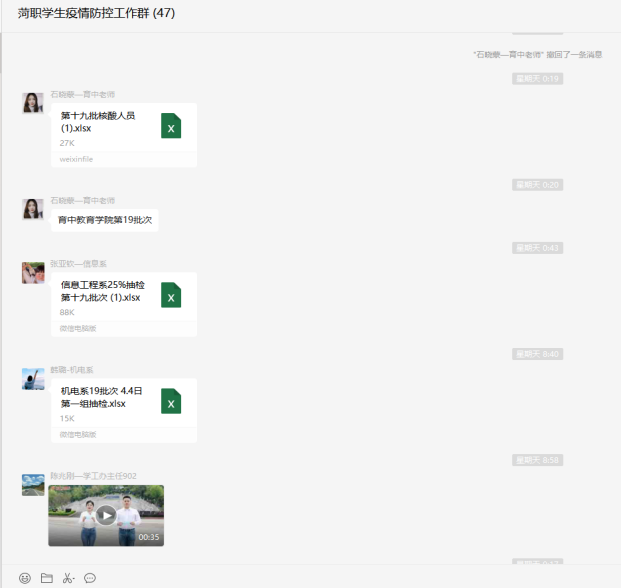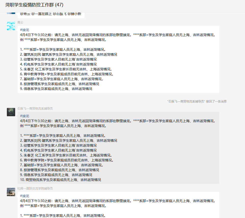 通过精准摸排实现学生数据工作的“全覆盖”,是疫情防控工作的重中之重。学生工作处充分发挥辅导员、班主任在校园疫情防控工作中的桥梁纽带作用,迅速组建了各系部疫情防控信息员队伍,建立了“菏职学生疫情防控工作群”、“菏职学生管理工作群”,全体学工人员、班主任24小时在线,“一对一” “点对点”“线上线下”做好各类信息统计工作,及时、精准、全面掌握学生动态,用实际行动筑牢疫情防控学生数据“第一道防线”。