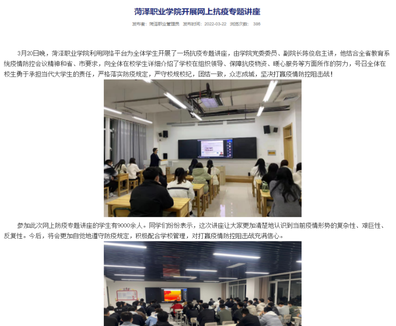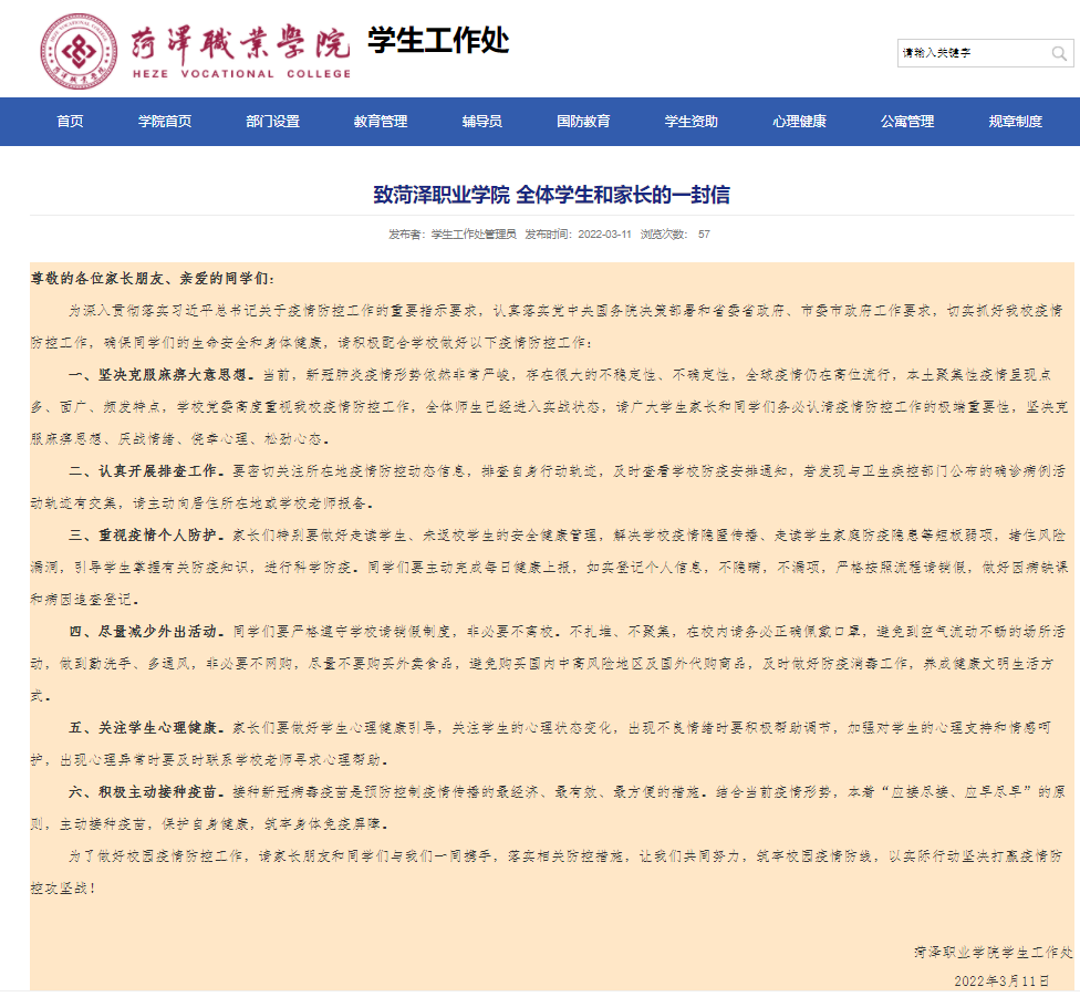全力以赴做好疫情防控工作,既是要求,更是责任与担当。在疫情防控期间,学工队伍克服困难,舍小家为大家,密切配合医务工作人员,现场组织学生累计完成三十一批次核酸抽检工作,确保整个核酸检测过程安全、高效、有序,充分展现了学工队伍的速度和学工服务的质量。同时,学工队伍严格按照上级要求,坚持每日一问,落实学生晨午检,实行“日报告”“零报告”,关心学生的健康生活状况。面对广大在校生,学工队伍联合学校各部门开展十项暖心活动,真正将爱的教育做到学生心坎里,彰显出了菏职学工队伍抗疫工作的力度、速度和温度。