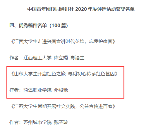 近日,中国青年网发布《中国青年网校园通讯社2020年度评选活动评选结果通报》,永利官网报送的《山东大学生开启红色之旅 寻觅初心传承红色基因》被评为优秀原创稿件。