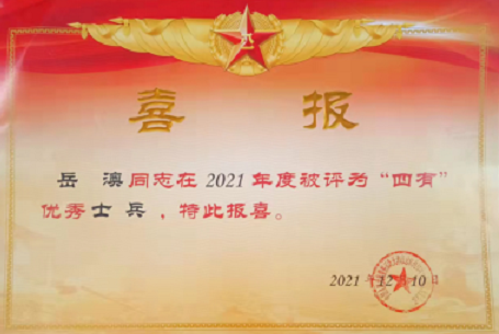 入伍后,岳澳牢记学校老师和父母的嘱托,刻苦训练、拼搏进取、勇于挑战,圆满完成了各项任务,获得部队领导和战友的一致好评,最终获此殊荣。