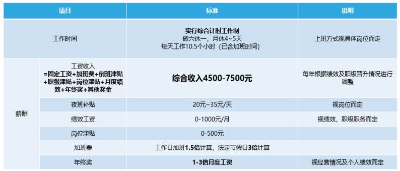 注意事项:以上工资水平为公司的平均水平,不同出勤、岗位和个人表现会有不同差异。