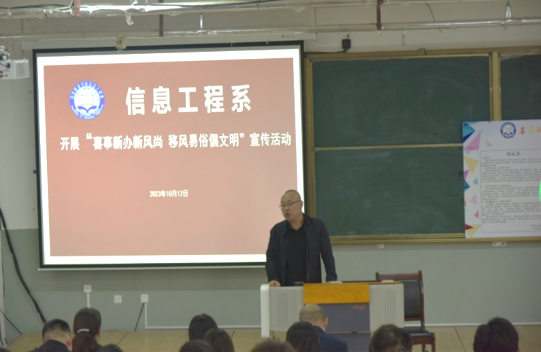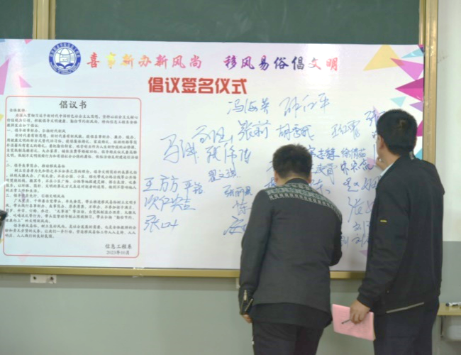 为深入贯彻习近平新时代中国特色社会主义思想,坚持以社会主义核心价值观为引领,积极倡导文明健康、勤俭节约新风尚,10月12日,信息工程系组织开展了“喜事新办新风尚 移风易俗倡文明”活动。