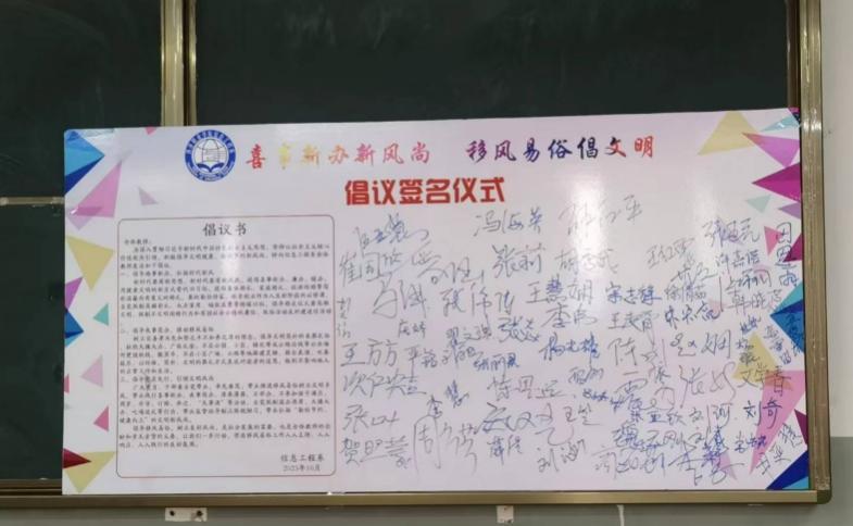 冯海英强调,让“婚事新办、丧事简办、喜事小办、办事从简、恶俗禁办”的观念深入每位教师的内心深处。广大党员、干部要以身作则,自觉带头,率先垂范,推进移风易俗,树立文明乡风,以榜样力量引领新风正气,以实际行动抵制不良习气,确保本次活动扎实有效,影响深远。会上,全体教师在倡议书签字板上进行了集体签名。