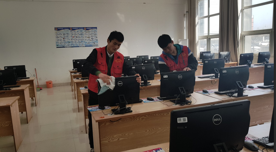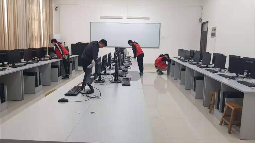 此次活动分为扫地、拖地、擦桌椅以及对机房内的教学设备进行清理。同学们以部门为单位准备清洁工具,全体成员共分为十一组,每组中又有合理的任务划分,男生扫地擦地,女生擦桌椅及进行室内整理。同学们积极主动,互帮互助,高效率地完成任务,使教室焕然一新。