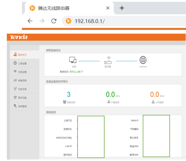 打开浏览器在地址栏内输入192.168.0.1,回车即可打开管理界面,输入默认用户名密码,如果未设置密码直接可进入到管理界面。