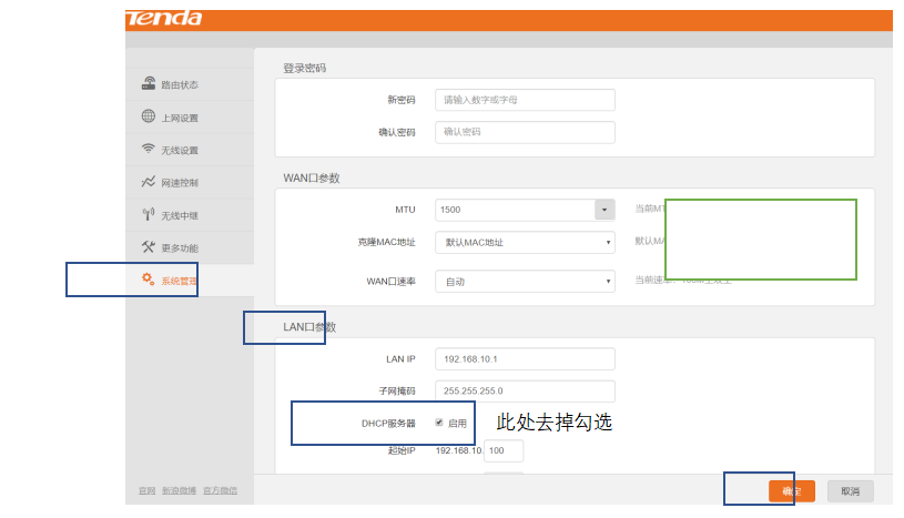 左侧导航栏打开系统管理-LAN口参数-DHCP服务器(去掉勾选)-关闭-确定,完成配置。(其他型号在导航栏找到DHCP关闭即可)