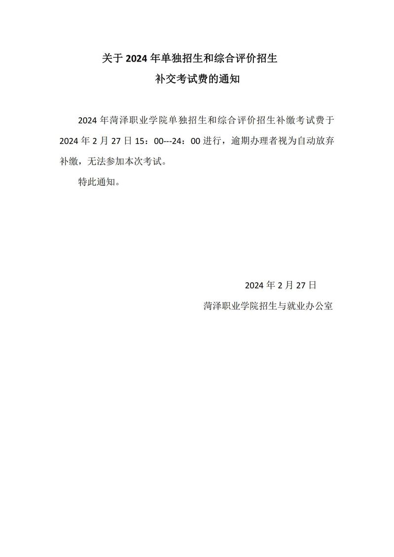 关于2024年单独招生和综合评价招生补交考试费的通知